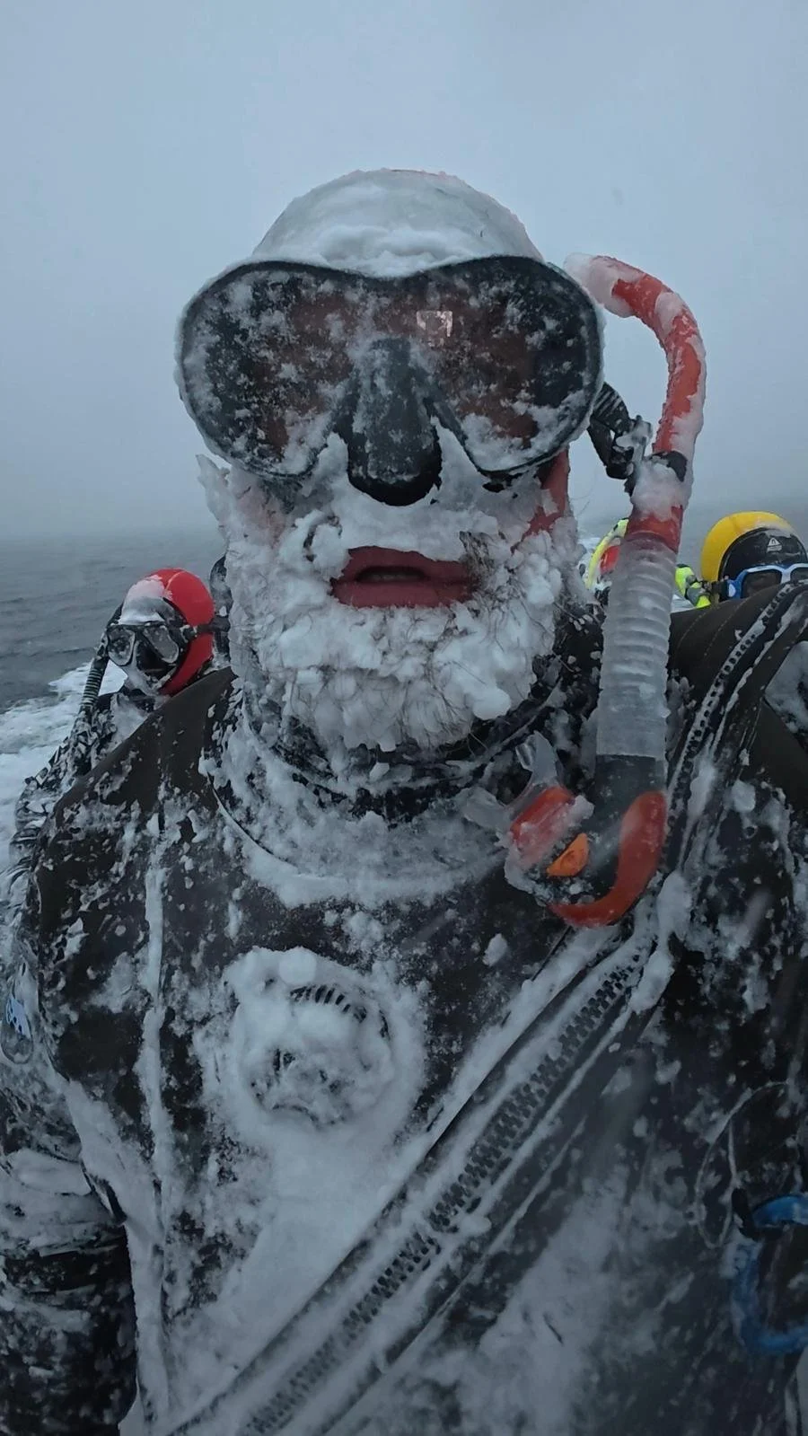 De dag start om 8 uur. In de ochtendlucht hangt een stille spanning. Gasten verzamelen zich, handen in de zakken, ademwolkjes in de vrieskou. We meten de droogpakken aan—het voelt een beetje als klaarmaken voor een expeditie, en dat ís het ook.