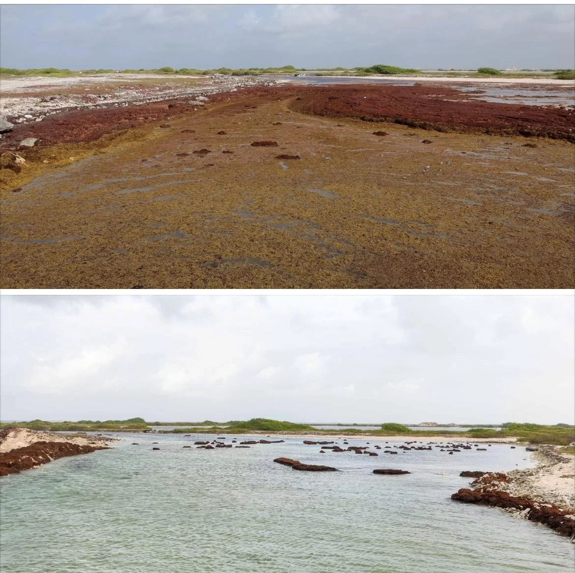 Het probleem werd veroorzaakt door een volledig door Sargassum dichtgeslibde ingang naar de Flamingo Sanctuary. Met een kleine groep vrijwilligers gingen we aan de slag. Het voelde eerst als een onbegonnen klus — daar sta je dan te scheppen, trekken, duwen — in een metersdikke stinkende laag Sargussum.